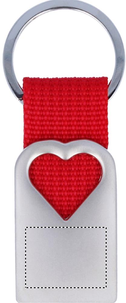 Металлический брелок для ключей с прорезью в виде сердечка и красным текстильным ремешком.