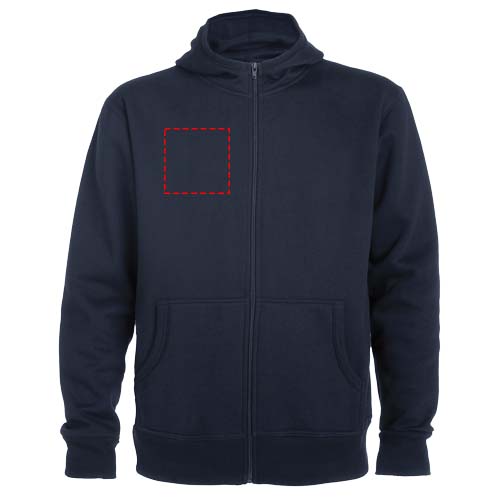 Худи с капюшоном, высоким воротником и полноразмерной молнией. Окантовка капюшона и карманов из ткани в рубчик. Карман-кенгуру. Манжеты рукавов и низ в рубчик 2 x 2. Съемная этикетка.
