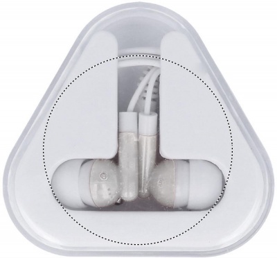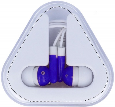 Наушники из ПВХ в треугольном футляре из пластика. Длина кабеля 120 см.
