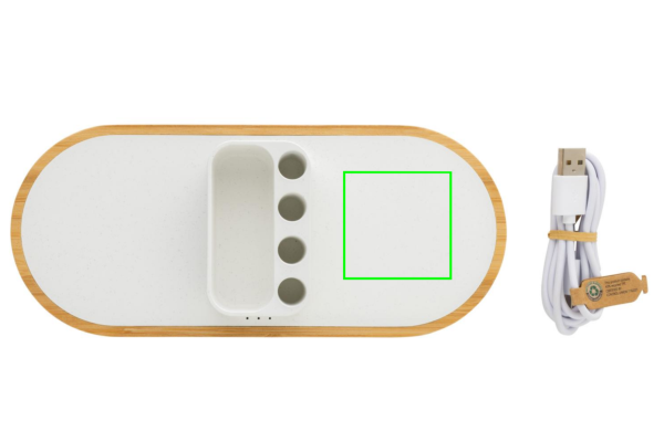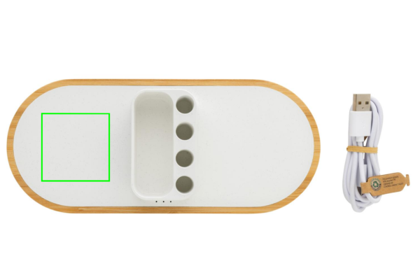 Двойное быстрое беспроводное зарядное устройство 10 Вт с держателем для ручки, изготовленное из сертифицированного RCS (Recycled Claim Standard) переработанного АБС. Общее содержание переработанных материалов: 31% от общего веса изделия. Сертификация RCS гарантирует полностью сертифицированную цепочку поставок переработанных материалов. Основание изготовлено из FSC®100% бамбука. Беспроводная зарядка совместима с Android последних поколений, iPhone 8 и выше. Может заряжать два телефона одновременно или заряжать любое другое беспроводное устройство. С 4 отверстиями для ручек для хранения ручек/карандашей и небольшим хранилищем для визитных карточек или других мелких предметов. Изделие и аксессуары не содержат ПВХ. В комплект входит 120-сантиметровый кабель для зарядки типа C из сертифицированного RCS переработанного ТПЭ. Упаковано в коробку FSC®mix kraft. Вход Type-C; Вход 5 В/2 А; 9 В/2 А; Беспроводной выход 5 В/1 А; 9 В/1,1 А; (10 Вт) Зарегистрированный дизайн®