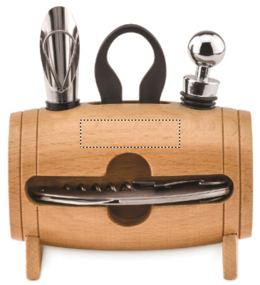 Деревянная подставка с 4 аксессуарами для вина. В наборе нож официанта, винная пробка, винный носик с пробкой и нож для среза фольги.