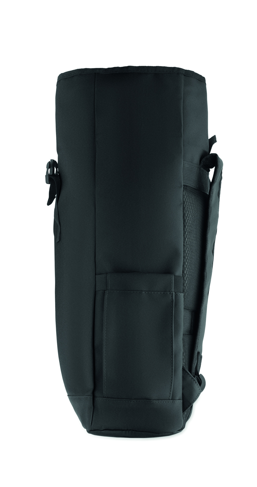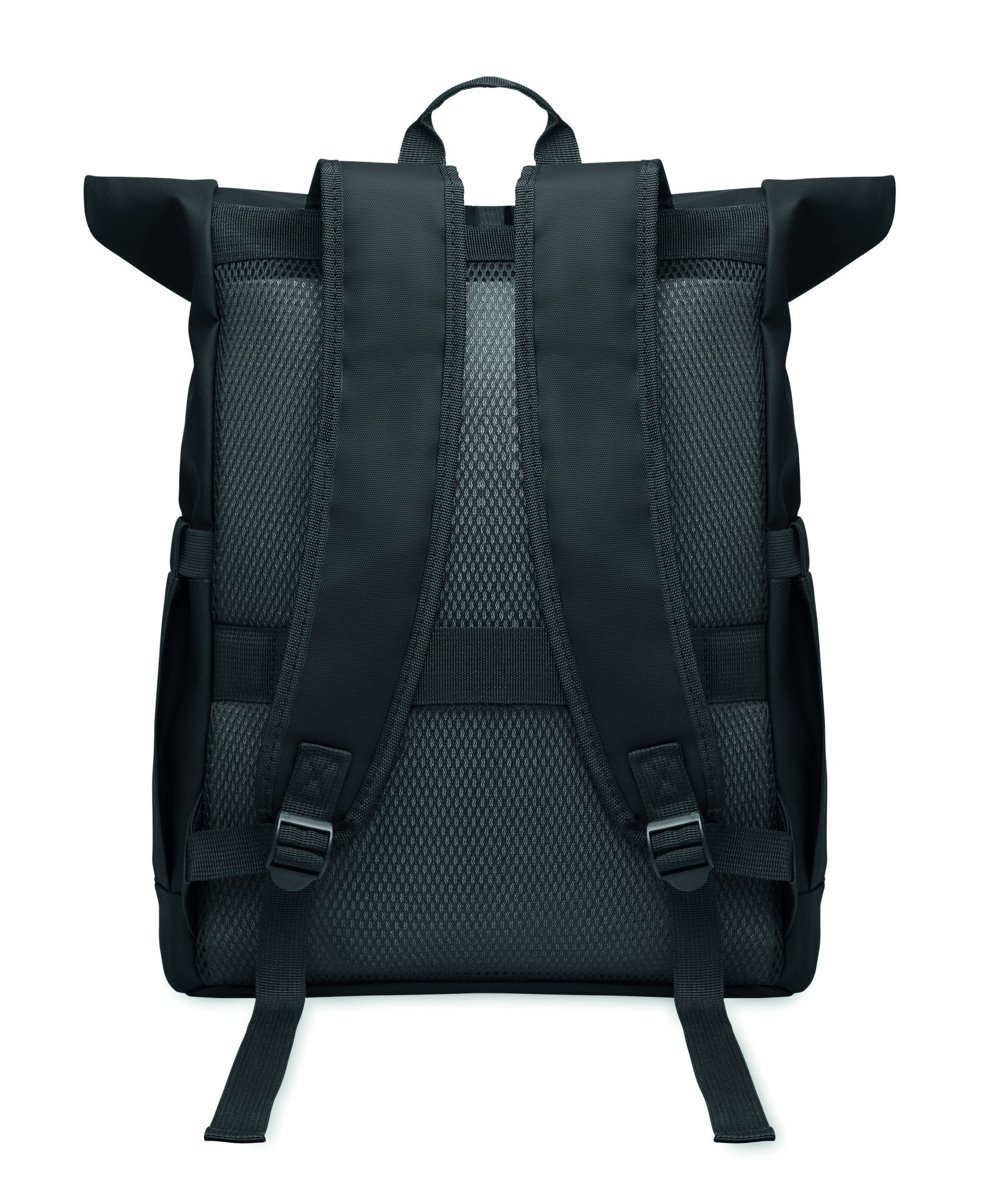 Roll top 15 inch laptop backpack in PU coated 600D RPET polyester and RPET polyester lining. Meshed padded back with zippered pocket and trolley strap. Padded shoulder strap with mesh inside finishing.
