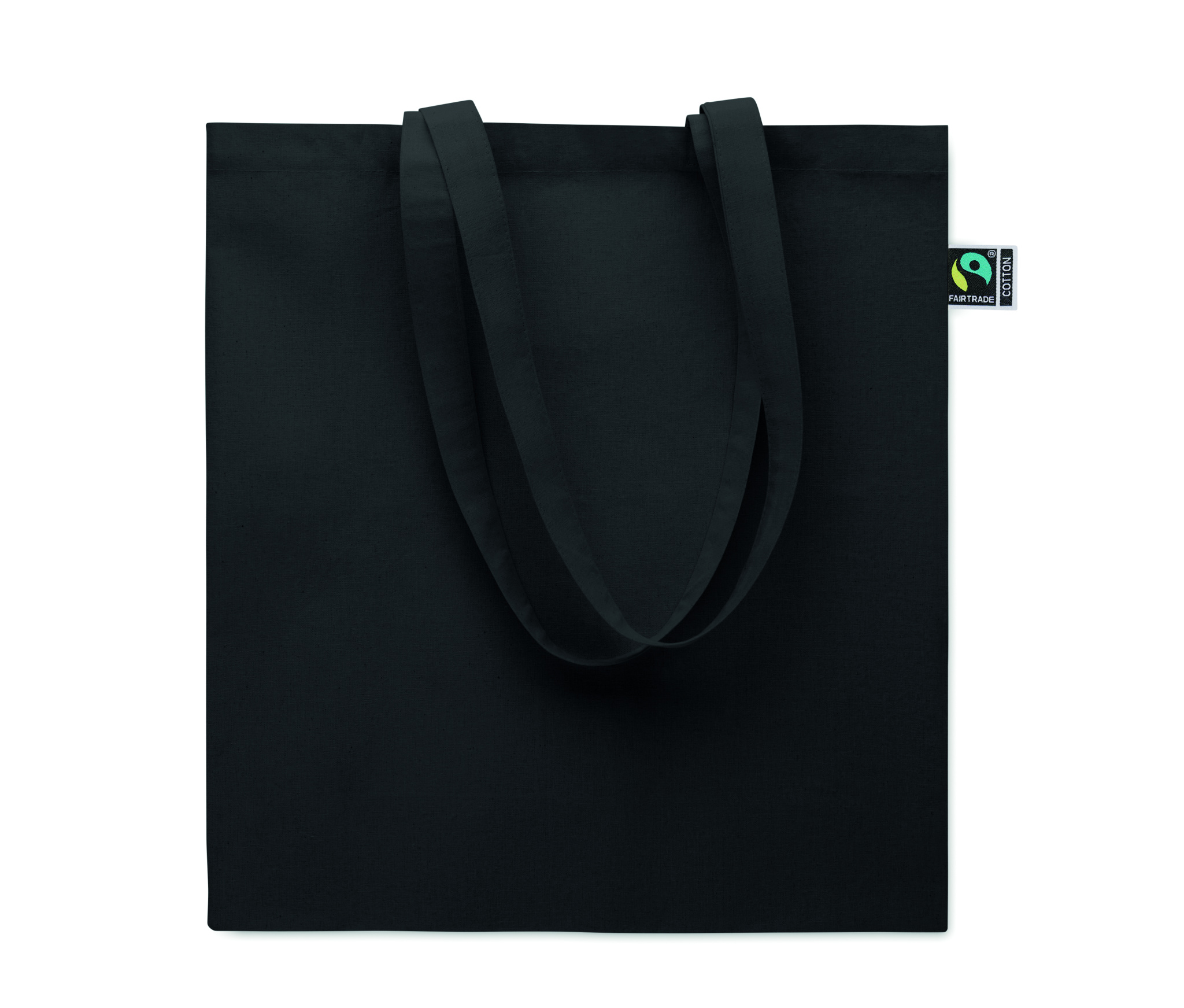 Kasse med långa handtag och bälg av Fairtrade-märkt bomull. 180 gr/m². Denna produkt är certifierad enligt OEKO-TEX® STANDARD 100.