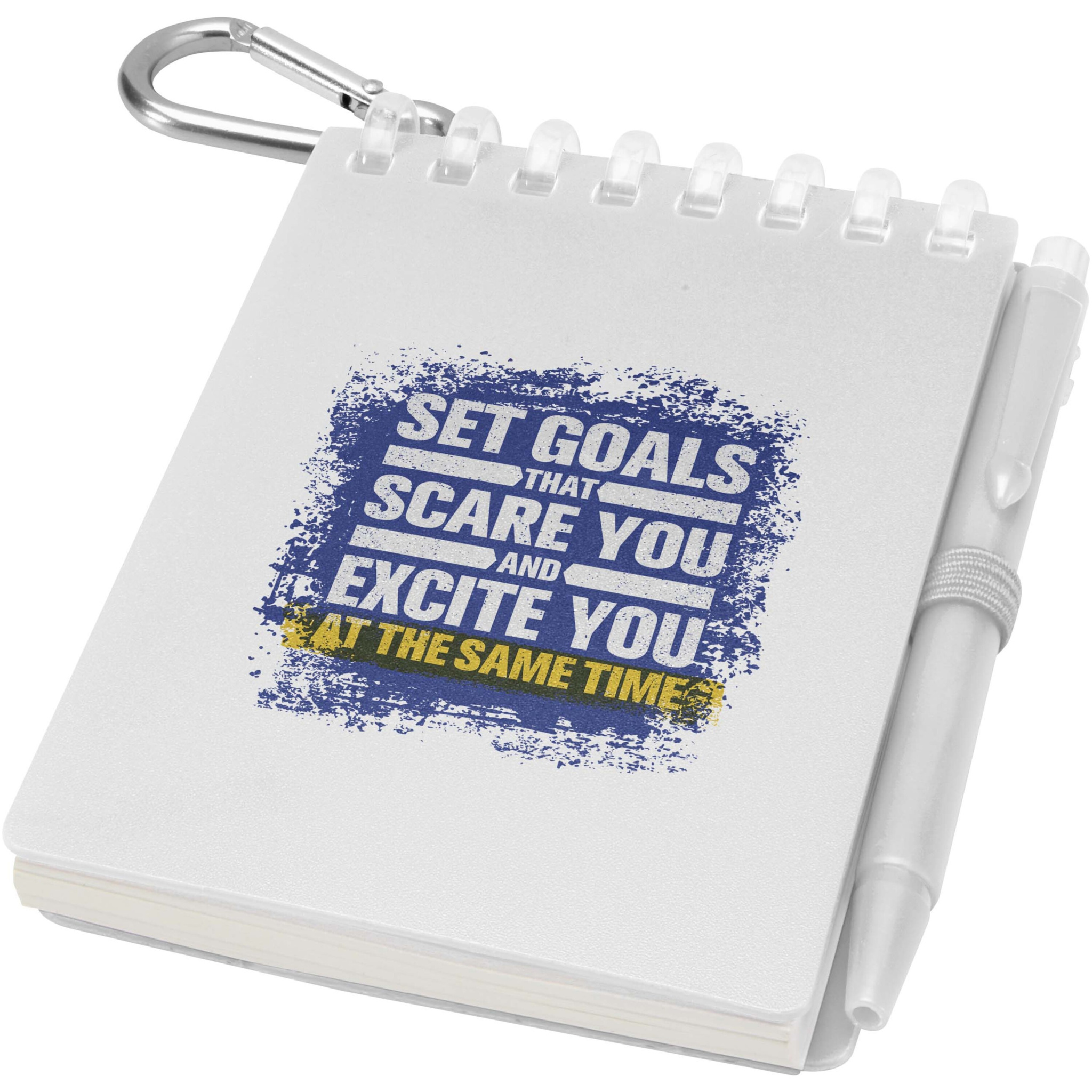 Uppsättningen med den lilla anteckningsboken Lig och penna är en kompakt och praktisk följeslagare för anteckningar när du är på språng. Den spiralbundna anteckningsboken har ett mjukt omslag av återvunnen plast och 70 blanka ark av 120 g/m² vattenresistent stenpapper, vilket gör den idealisk för utomhusbruk. Med rundade hörn och en inbyggd pennögla följer den trenden med ministorlek samtidigt som den är funktionell. Den matchande kulspetspennan är tillverkad av återvunnen ABS-plast, har svart bläck och en skrivlängd på 250 meter. En färgkoordinerad metallring gör att setet enkelt kan fästas på en ryggsäck, handväska eller nyckelring, vilket gör den perfekt för hållbara och bärbara anteckningar. Storlek på anteckningsbok: 11 x 7,5 cm.