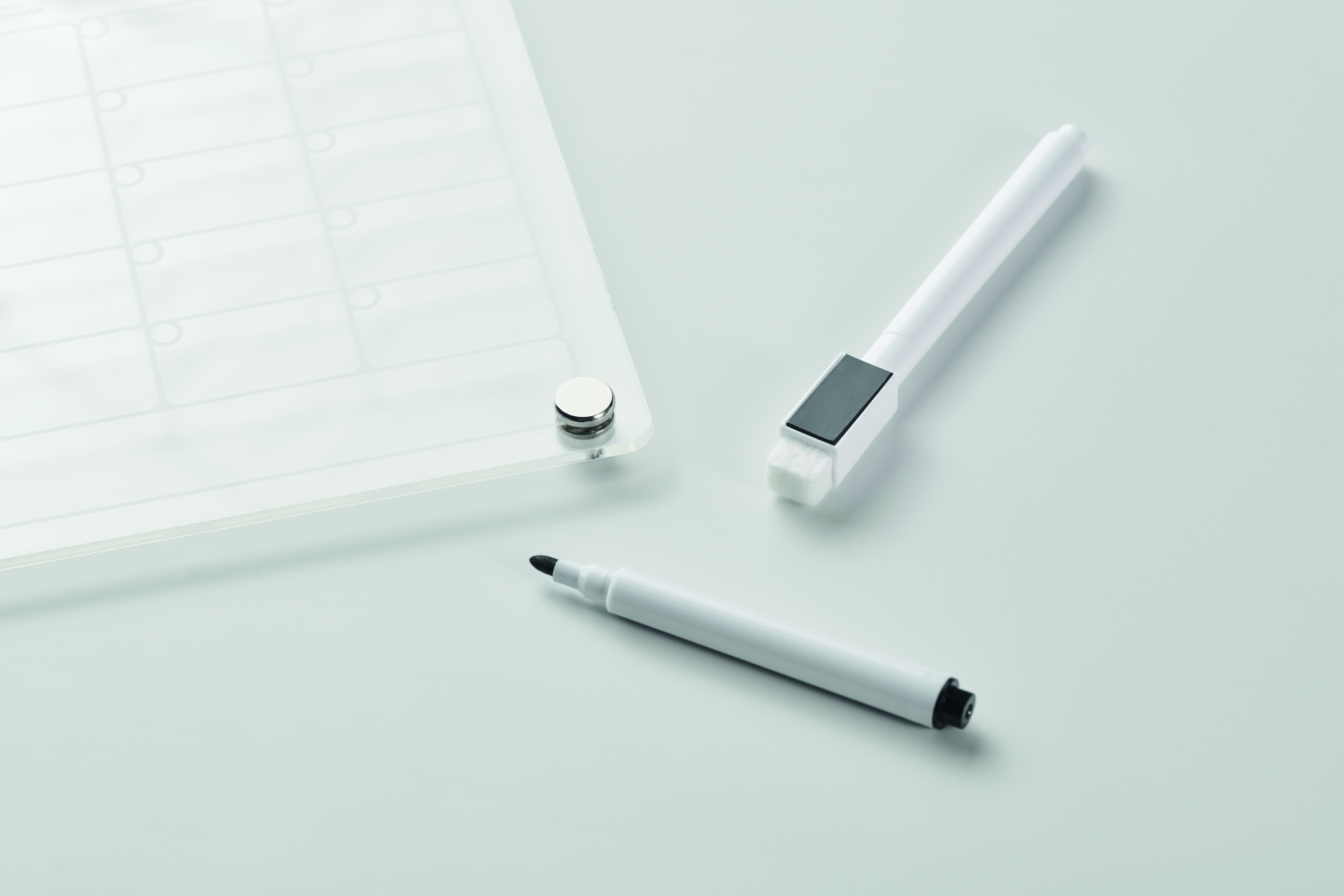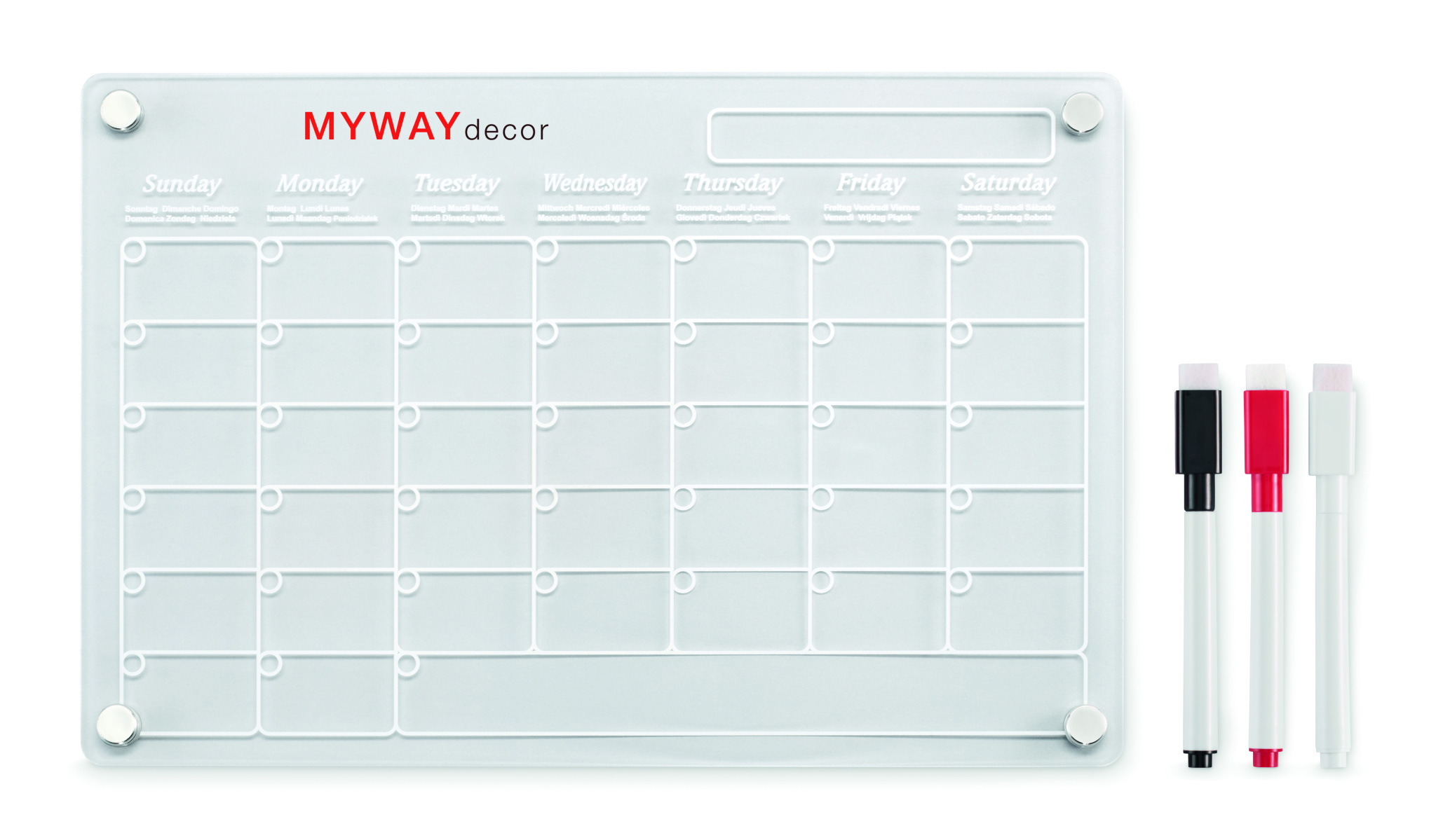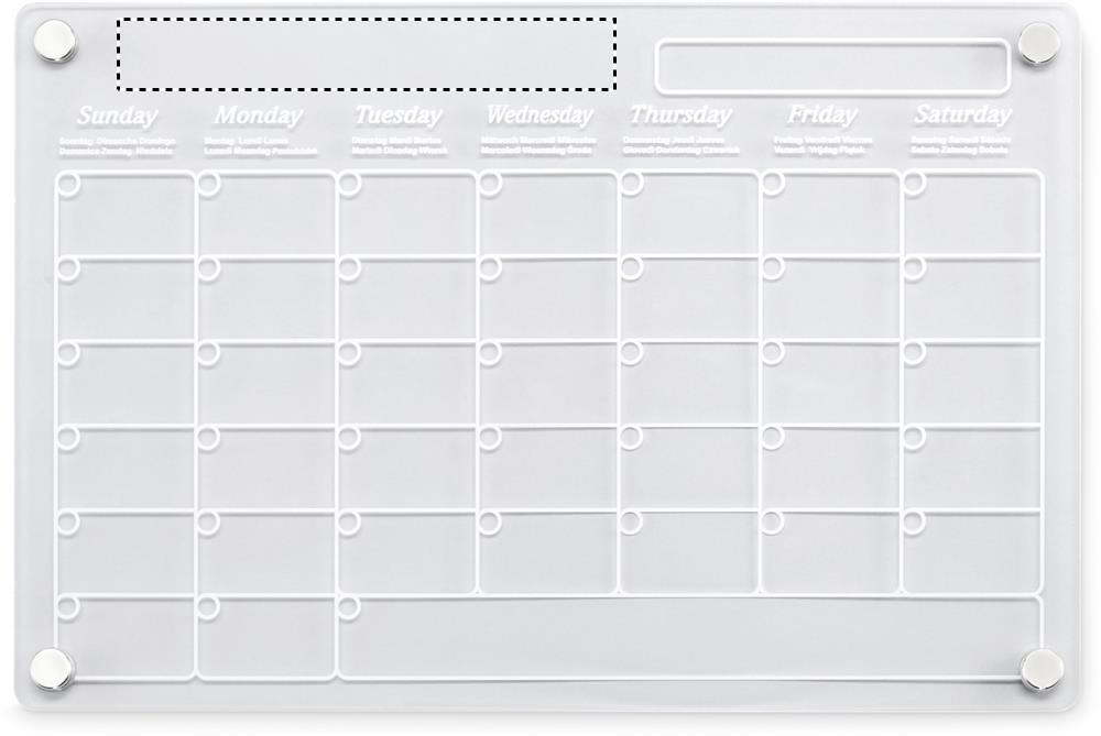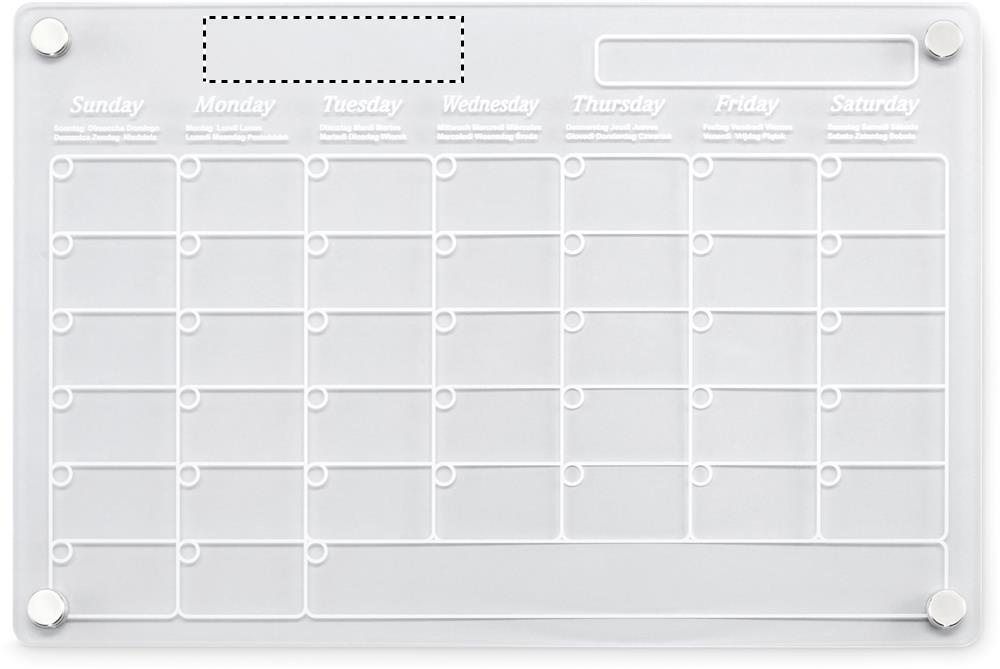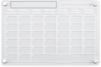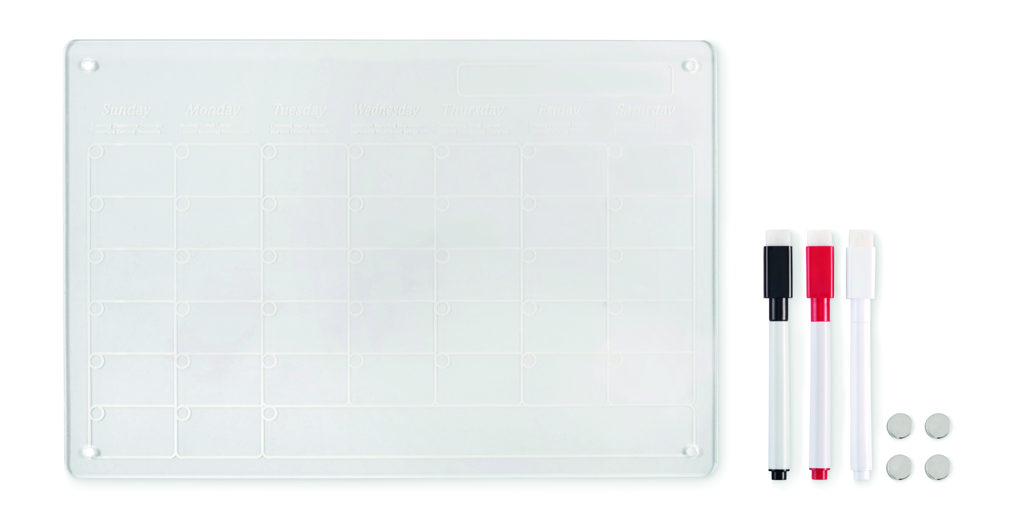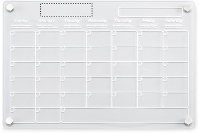 Magnetisk månadskalender i akryl i A4-storlek med 3 raderbara magnetiska markörer (svart, röd och vit). Inklusive skruvar för montering.