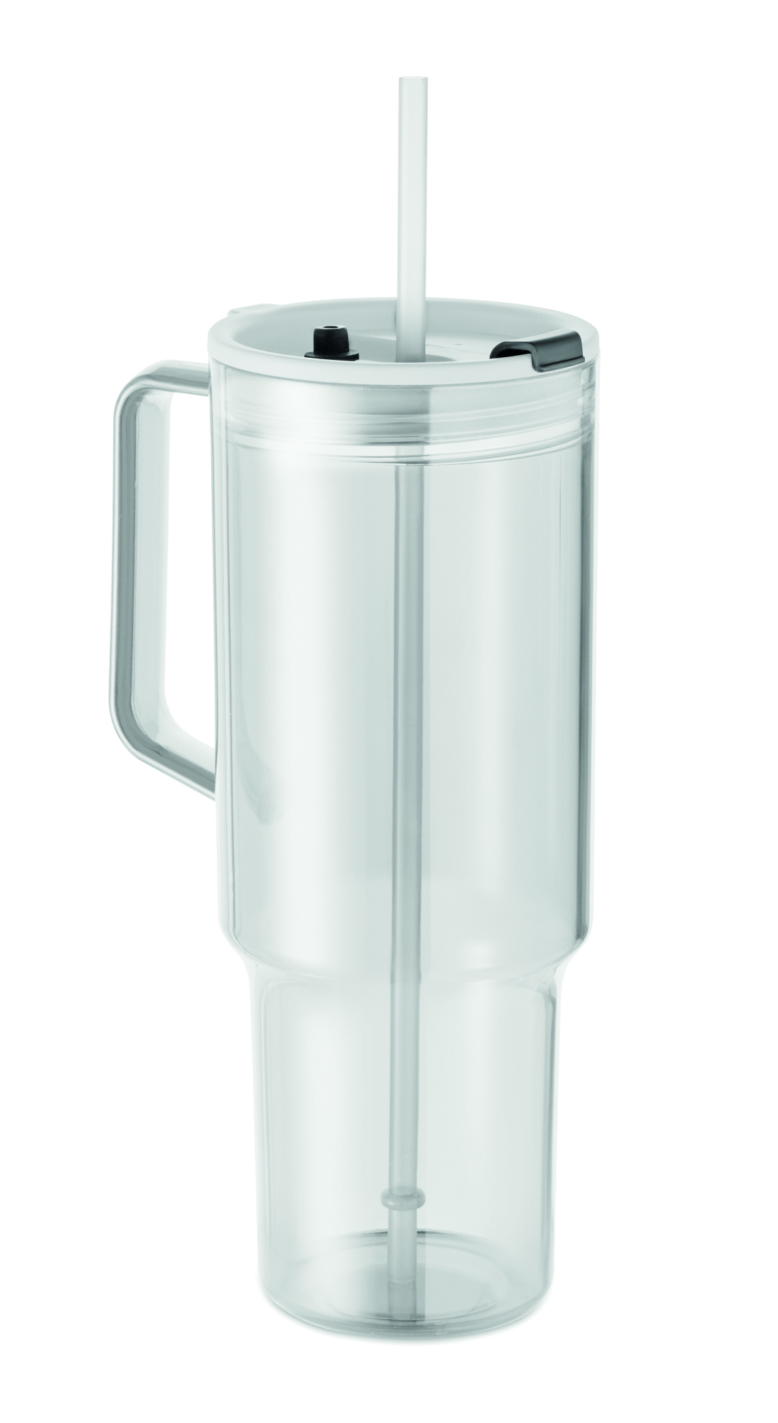 Mugg i RPET med sugrörslock inklusive sugrör i PP. Volym: 1200 ml.