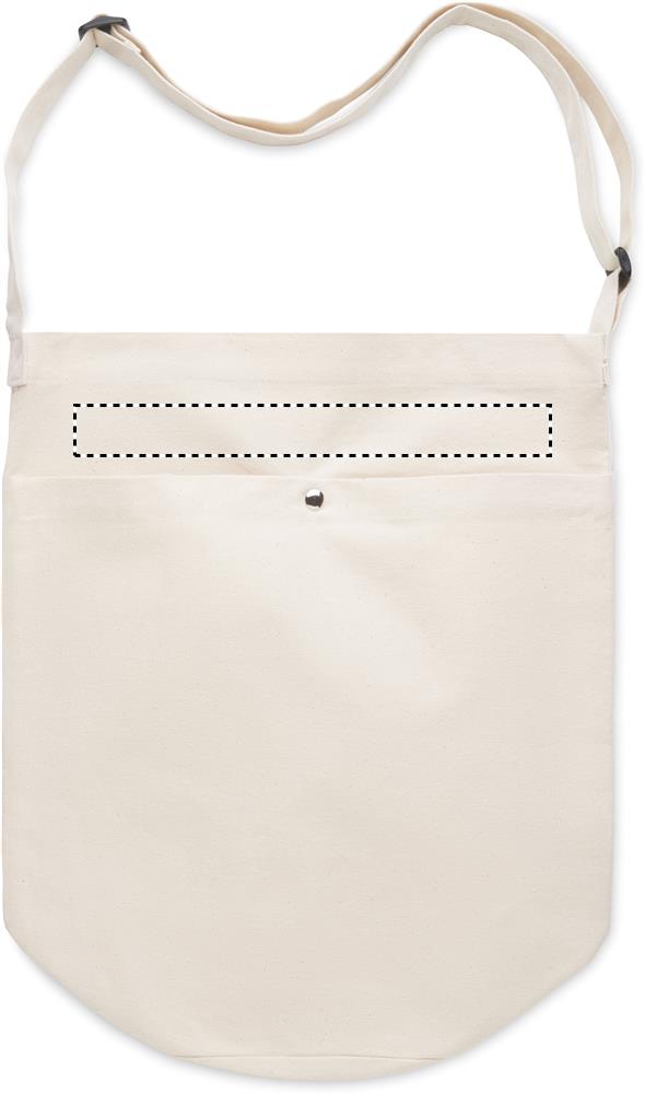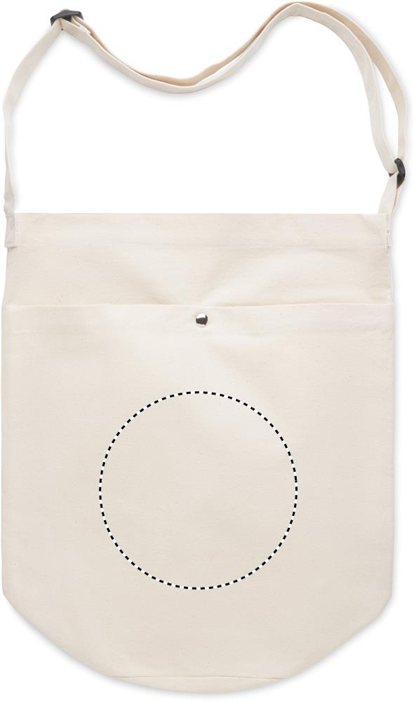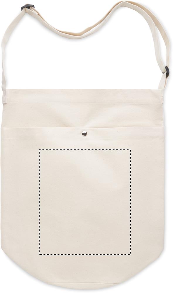 Kasse i naturfärgad canvas med lång justerbar axelrem och stor framficka med tryckknappstängning. Har innerficka. 270 gr/m².