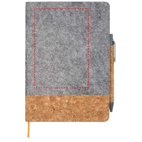 Den inbundna A5-anteckningsboken är tillverkad av kork och återvunnen filt och har 80 linjerade ark med 70 g/m² papper, elastisk förslutning, bokmärke och pennögla. Kulspetspennans knapp, klämma och spets är tillverkade av återvunnen plast och pennkroppen är tillverkad av kork. Pennans bläck: Svart. Skrivlängd: 600 meter. NIB-storlek: 1,0 mm.